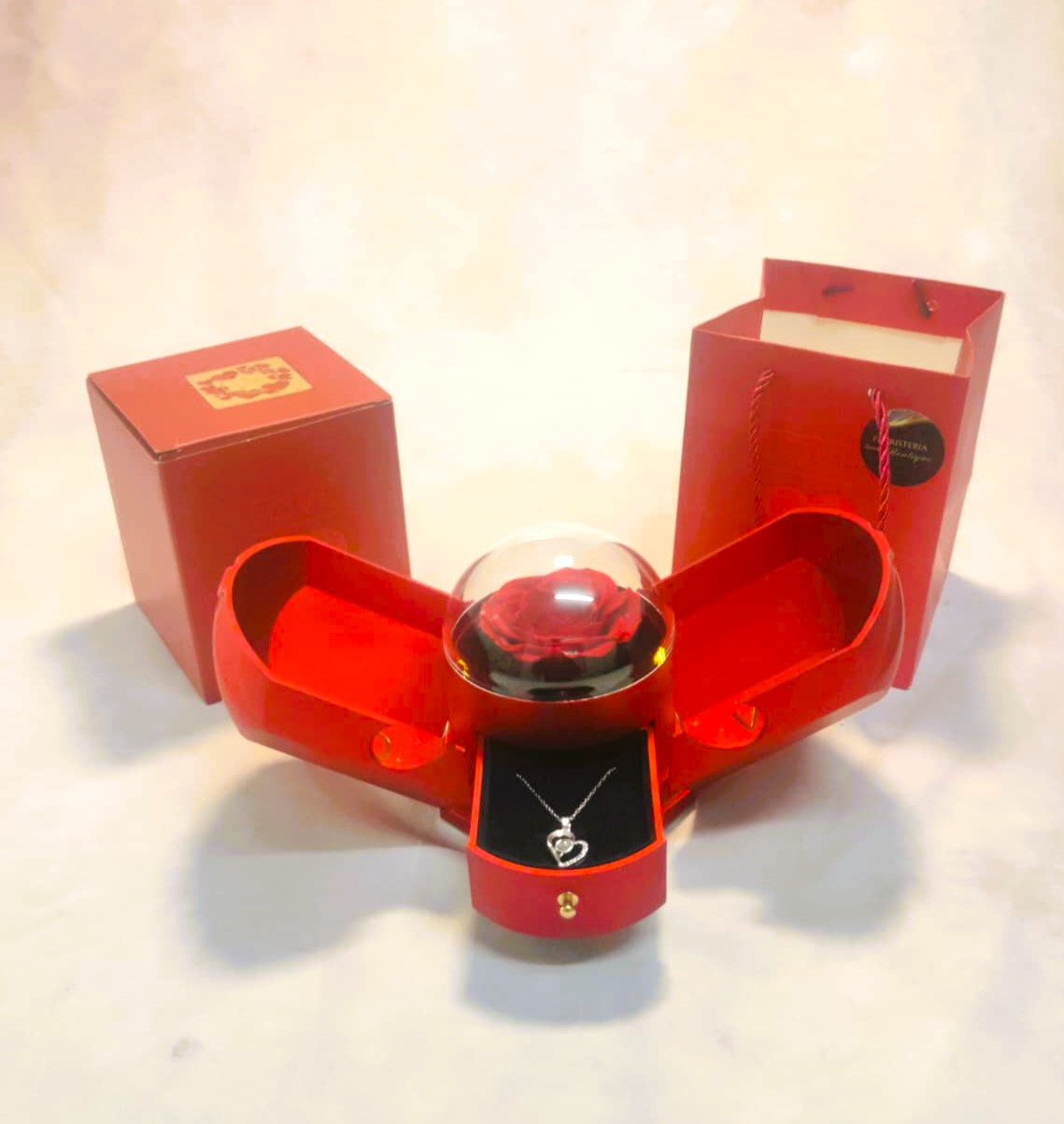 La rosa eterna, protegida en una cúpula transparente, simboliza un amor que perdura, mientras que el collar con colgante de acero antialérgico en forma de corazón con una piedra luna y una inscripción romántica en el interior añade un toque de brillo y sofisticación.