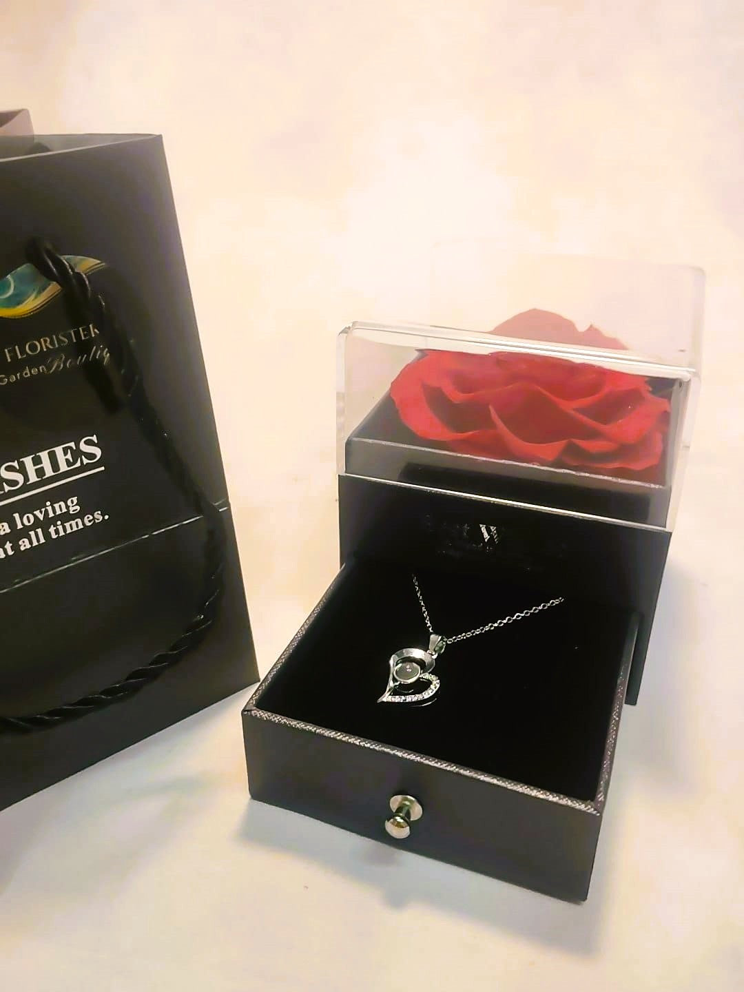 Sorprende a esa persona especial con nuestro exclusivo set con rosa eterna y un collar de acero antialérgico, un detalle que combina elegancia, romanticismo y significado. La rosa, presentada en una caja acrílica transparente, simboliza un amor que perdura en el tiempo, mientras que el collar con colgante en forma de corazón con una piedra luna y una inscripción romántica en el interior añade un toque de brillo y emoción.
