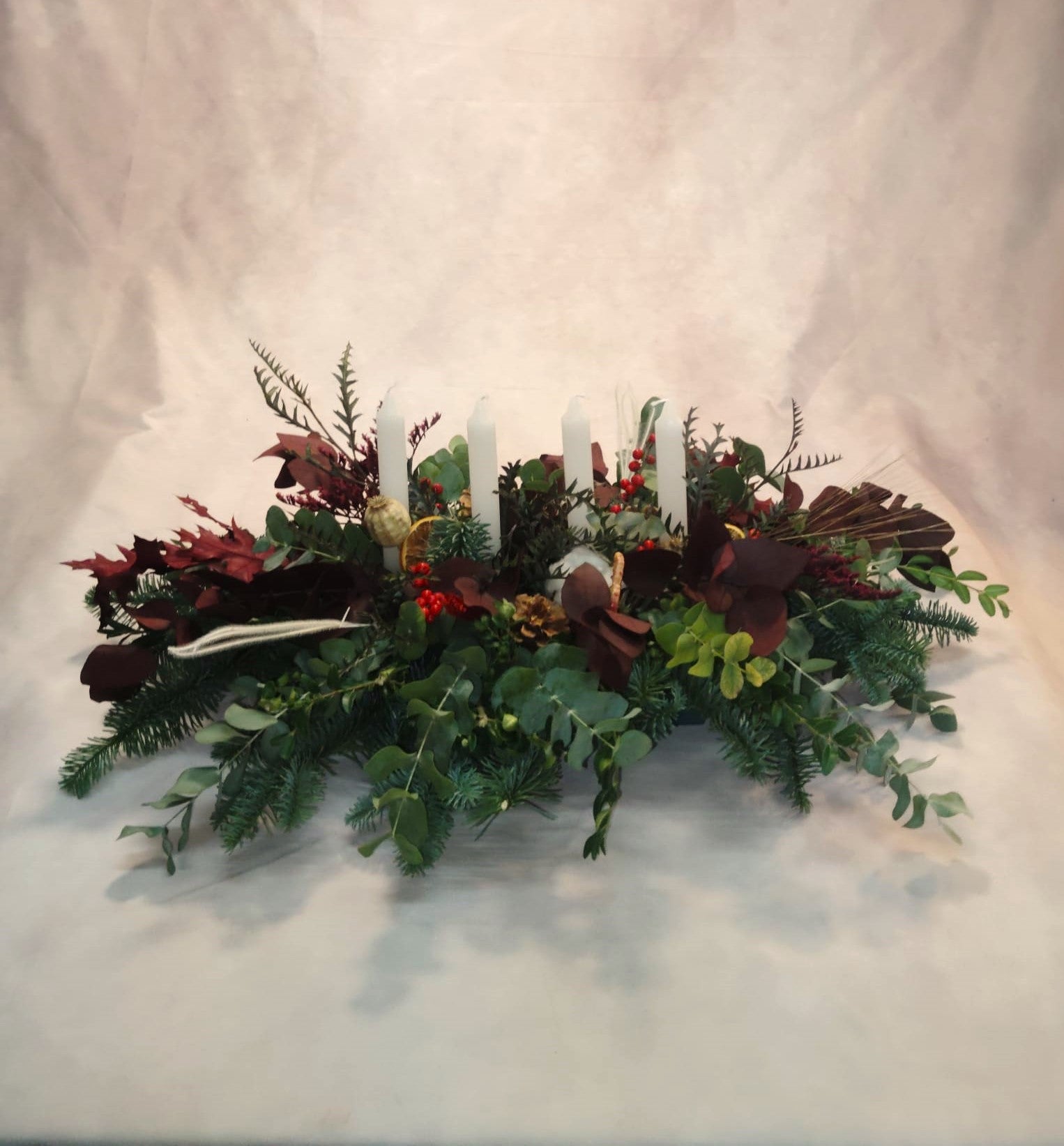 Cada diseño incluye velas blancas elegantes que aportan calidez y estilo a tus celebraciones. Perfecto para decoración de invierno, eventos festivos, cenas navideñas y regalos florales personalizados.