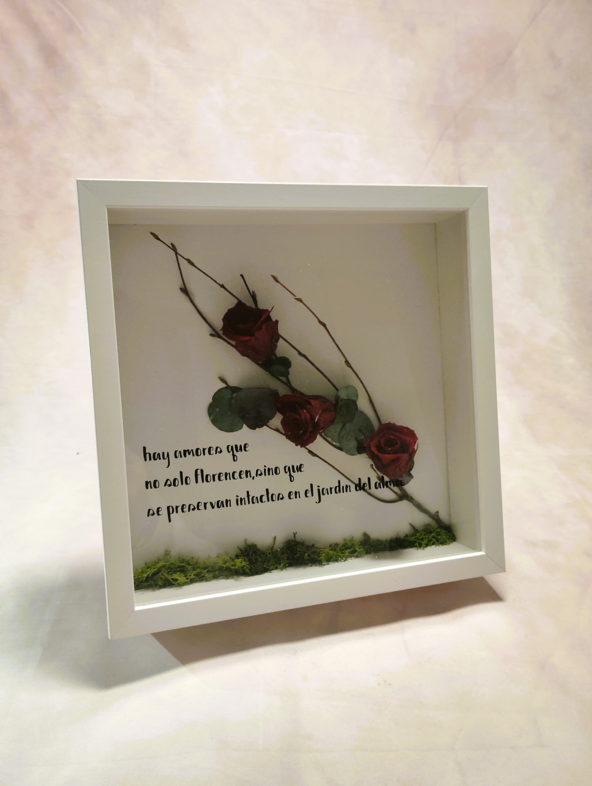 Cuadro floral preservado con rosas eternas rojas, diseñado para quienes buscan un regalo único, elegante y lleno de significado.
