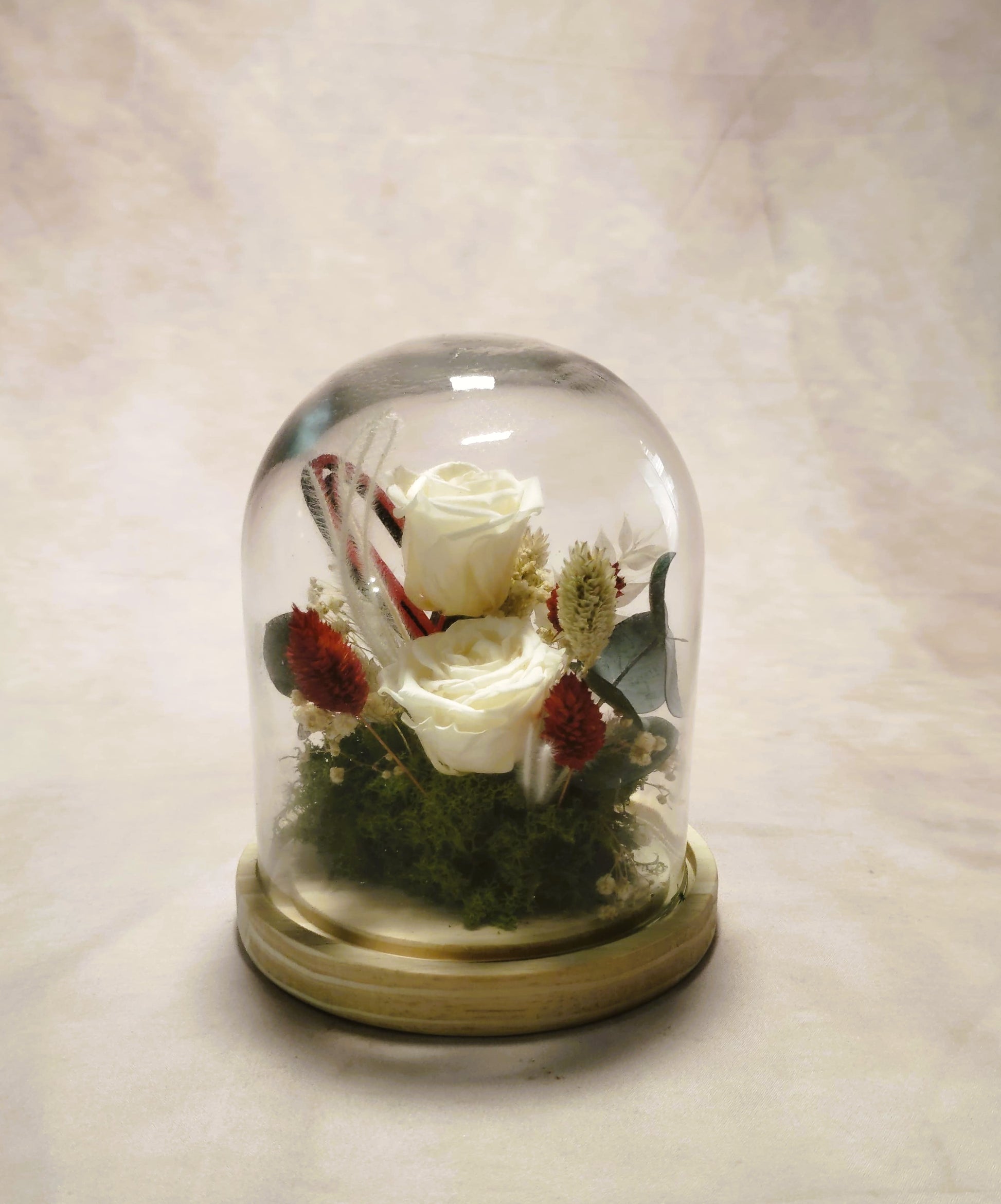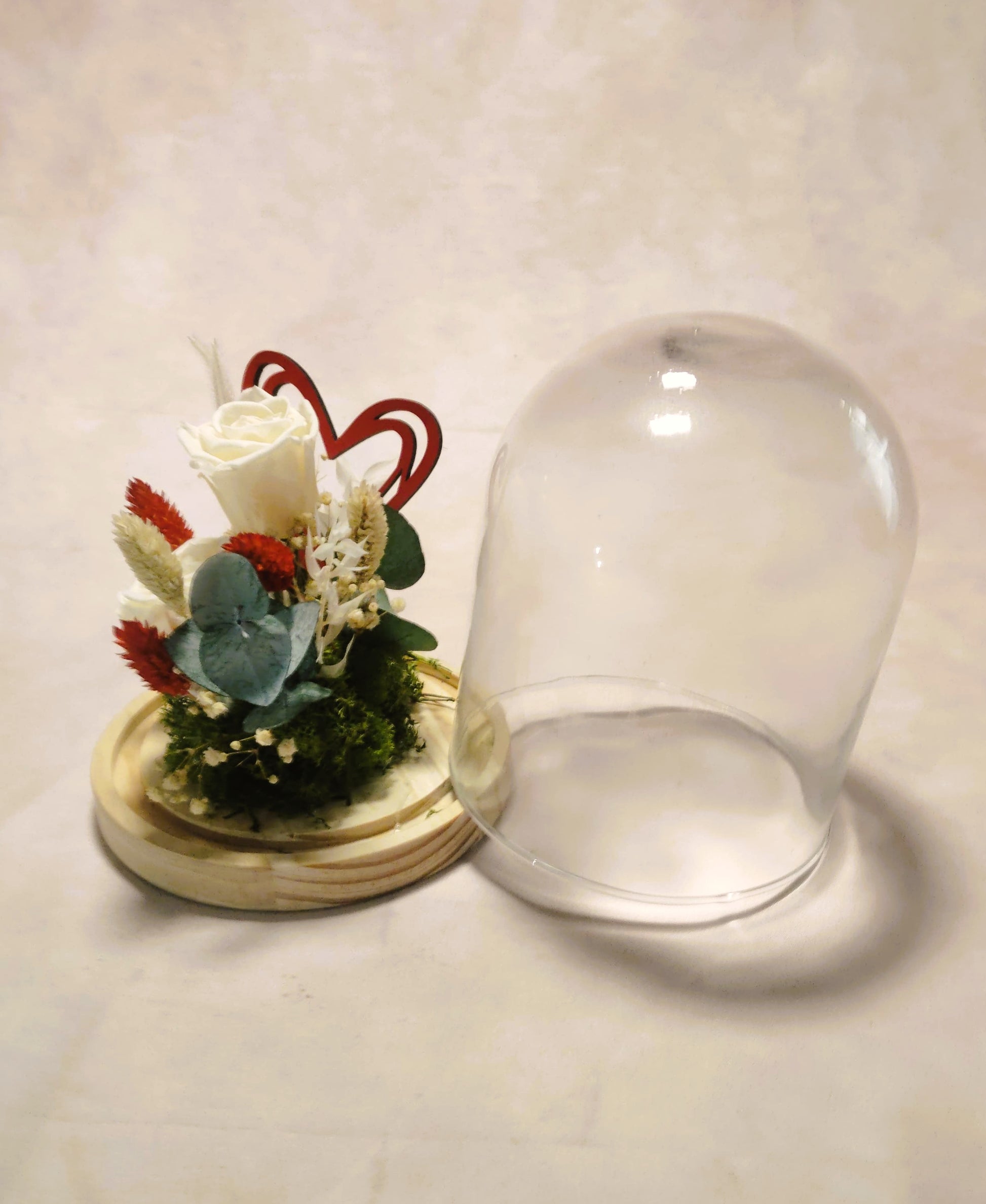Descubre una colección exclusiva de arreglos artesanales, domos decorativos premium, flores preservadas de larga duración y detalles románticos hechos a mano. Arreglo con rosa blanca, flores secas rojas y beige, eucalipto y musgo decorativo, presentado sobre una base de madera con corazones entrelazados ternura y elegancia.