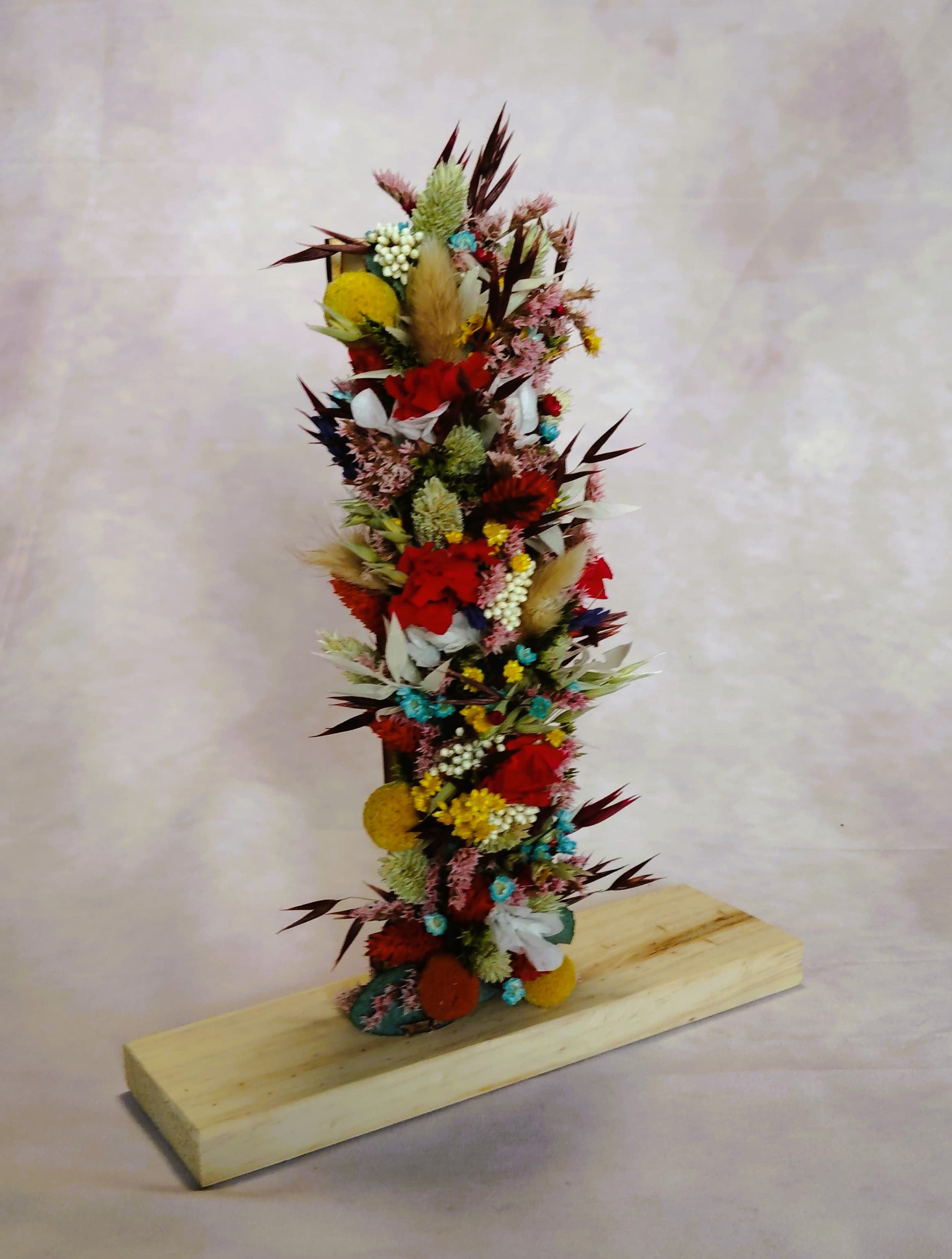 Cada flor está seleccionada y colocada a mano para formar una estructura vertical compacta, llena de color y movimiento. La base de letra de madera aporta calidez y un toque rústico moderno, convirtiéndola en una pieza perfecta para decoración del hogar, regalos personalizados, eventos, bodas, aniversarios o como detalle especial para escaparates y negocios.