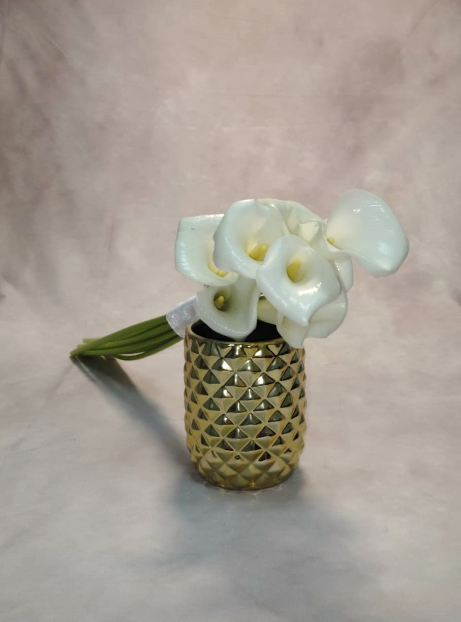 Ramo de novia elaborado con ocho calas blancas naturales, ideal para ceremonias elegantes y minimalistas.