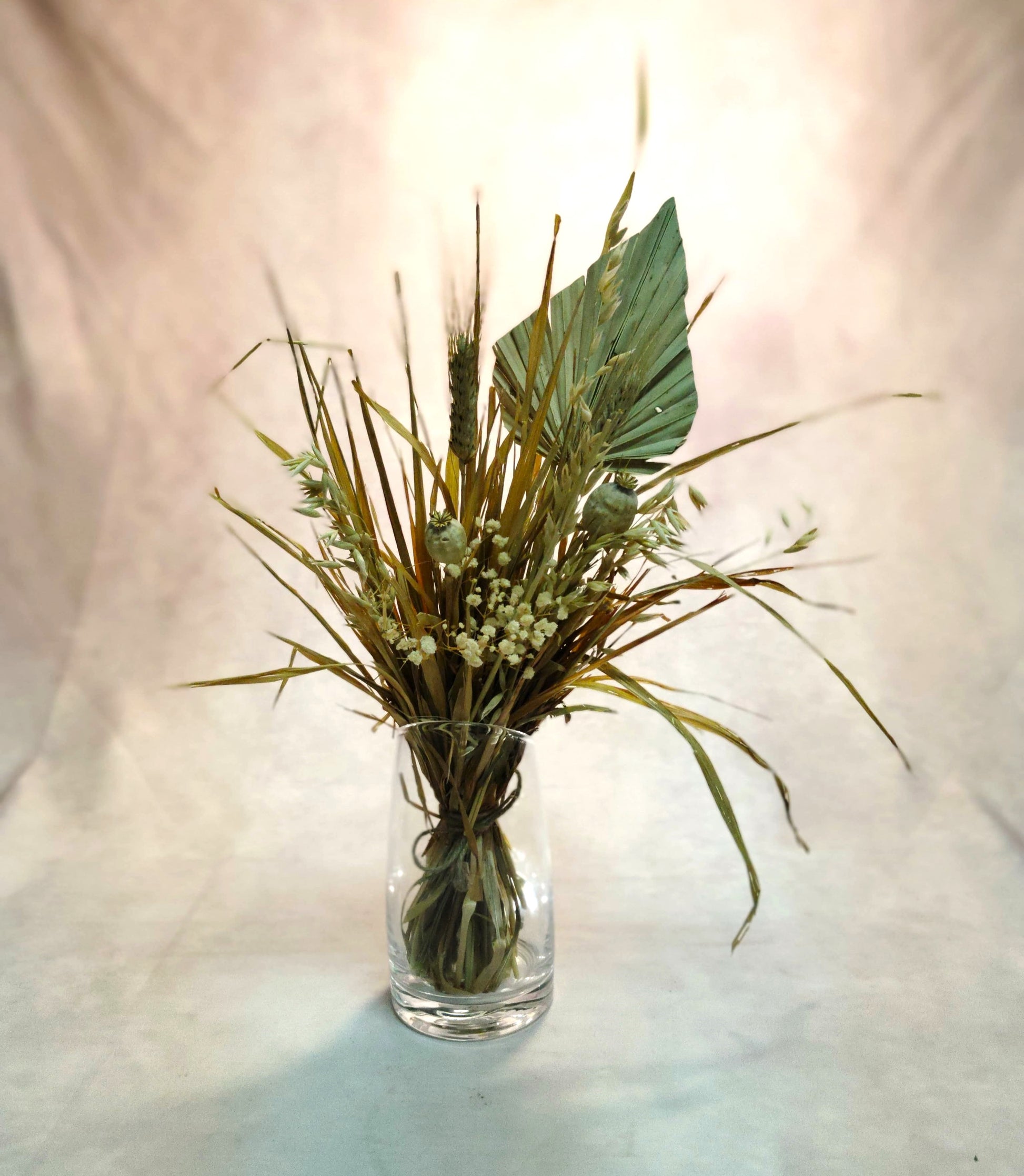 Esta encantadora composición de flores preservadas incluye una hoja de palmera que aporta un toque tropical y exótico.